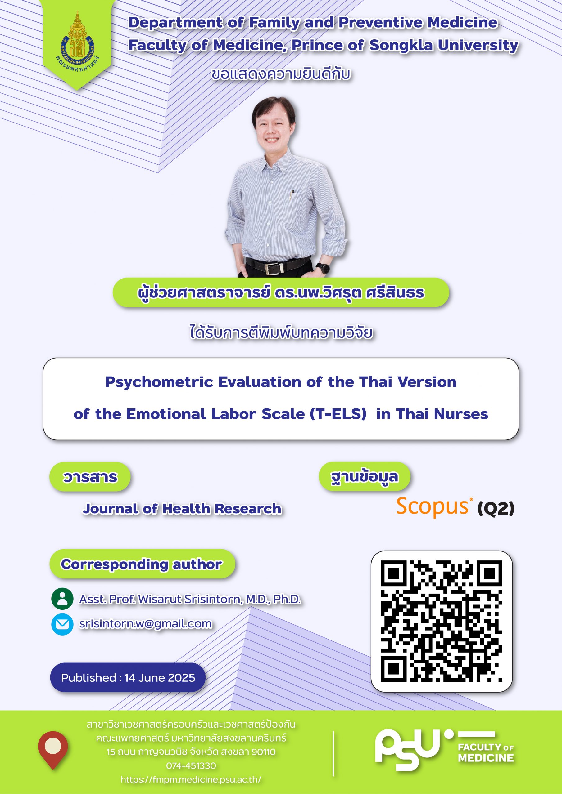 ขอแสดงความยินดีกับ ผศ.ดร.นพ.วิศรุต ศรีสินธร ที่ได้รับการตีพิมพ์บทความวิจัย เรื่อง Psychometric Evaluation of the Thai Version of the Emotional Labor Scale (T-ELS) in Thai Nurses