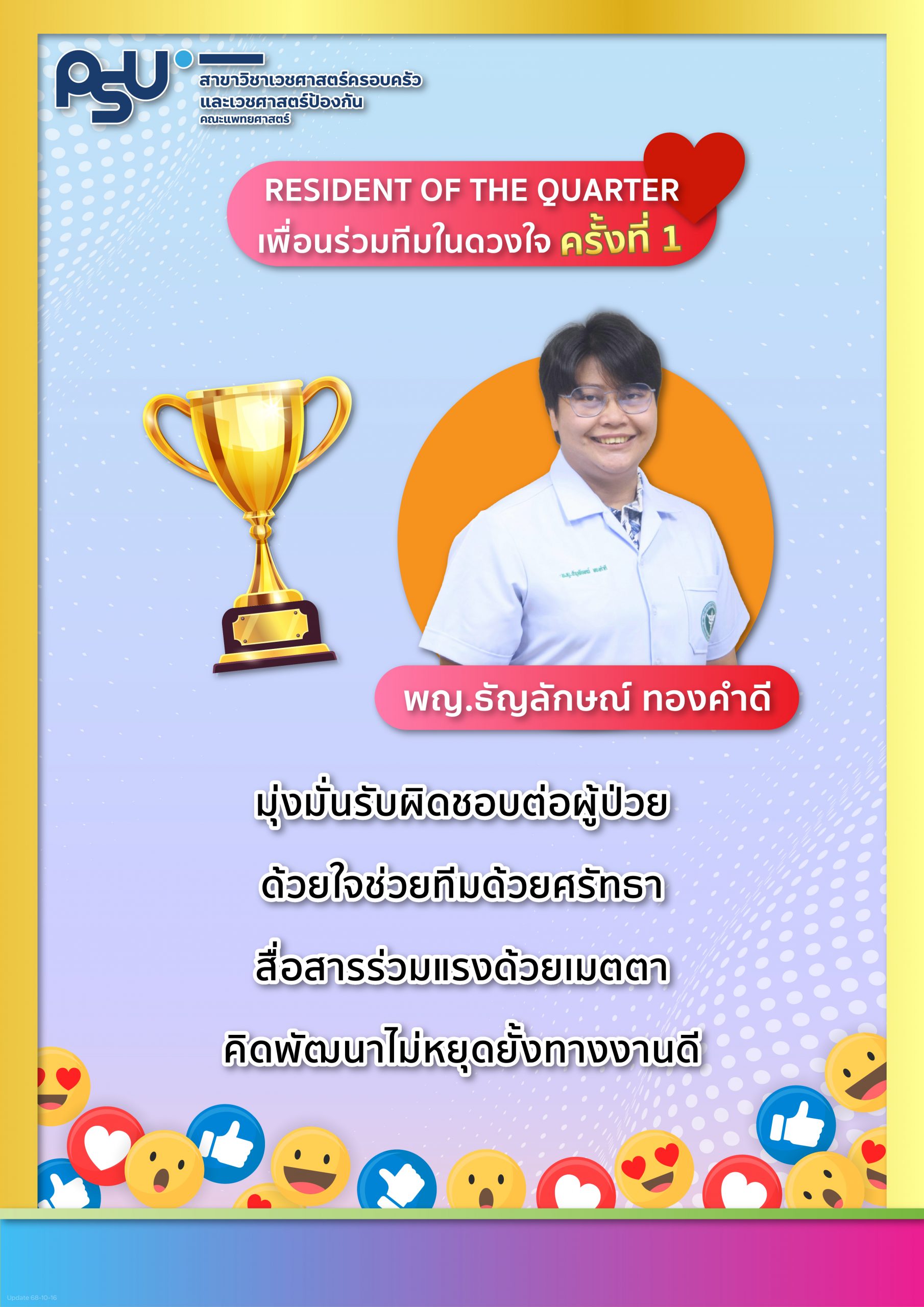 สาขาวิชาเวชศาสตร์ครอบครัวและเวชศาสตร์ป้องกัน ขอแสดงความยินดีกับ พญ.ธัญลักษณ์ ทองคำดี ในโอกาสที่ได้รับการโหวตเป็น Resident of the Quarter (พชท. / พจบ. ดีเด่น) ครั้งที่ 1