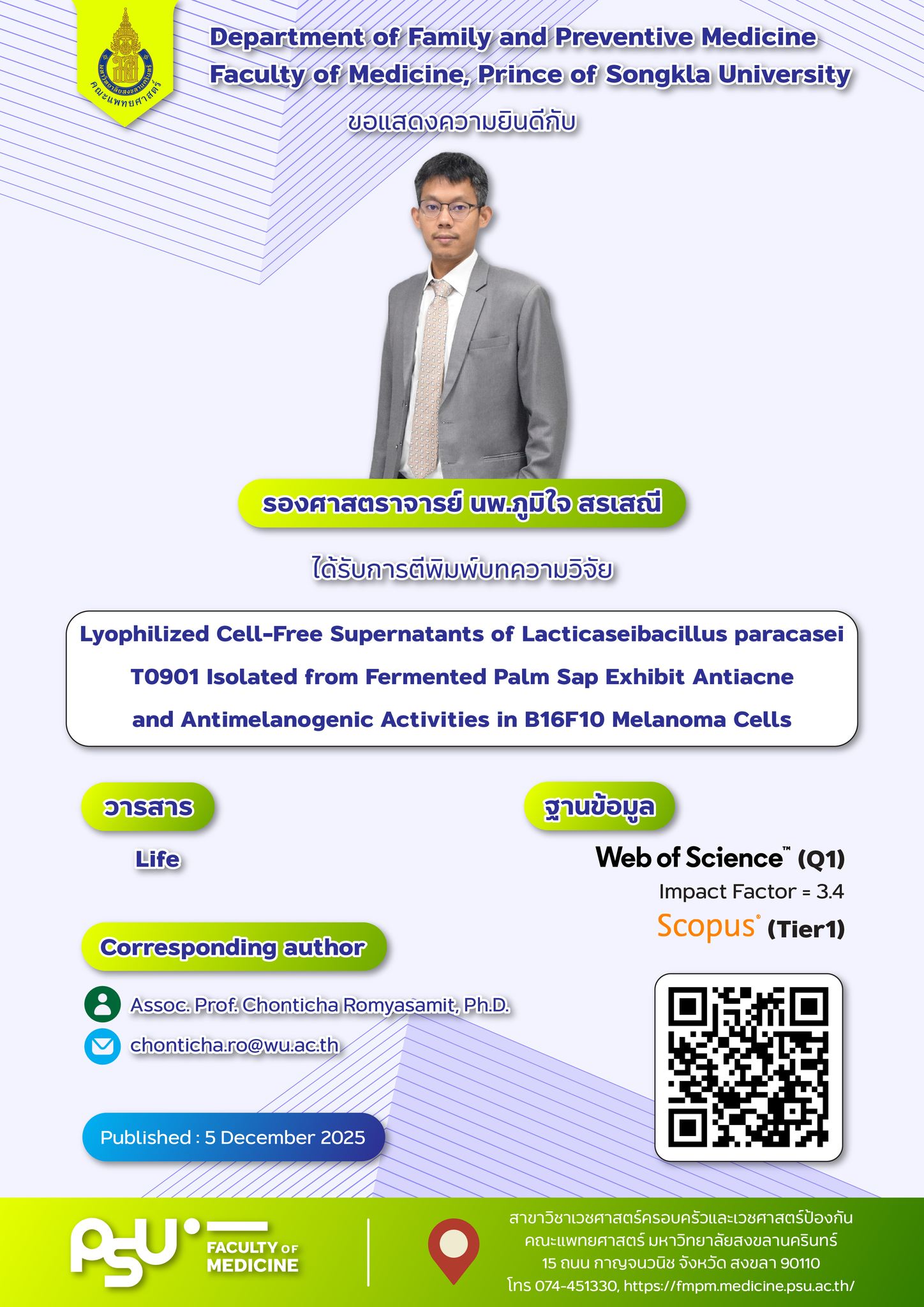 แสดงความยินดีกับ รศ.นพ.ภูมิใจ สรเสณี (ชื่อแรก) ได้รับการตีพิมพ์ เรื่อง Lyophilized Cell-Free Supernatants of Lacticaseibacillus paracasei T0901 Isolated from Fermented Palm Sap Exhibit Antiacne and Antimelanogenic Activities in B16F10 Melanoma Cells
