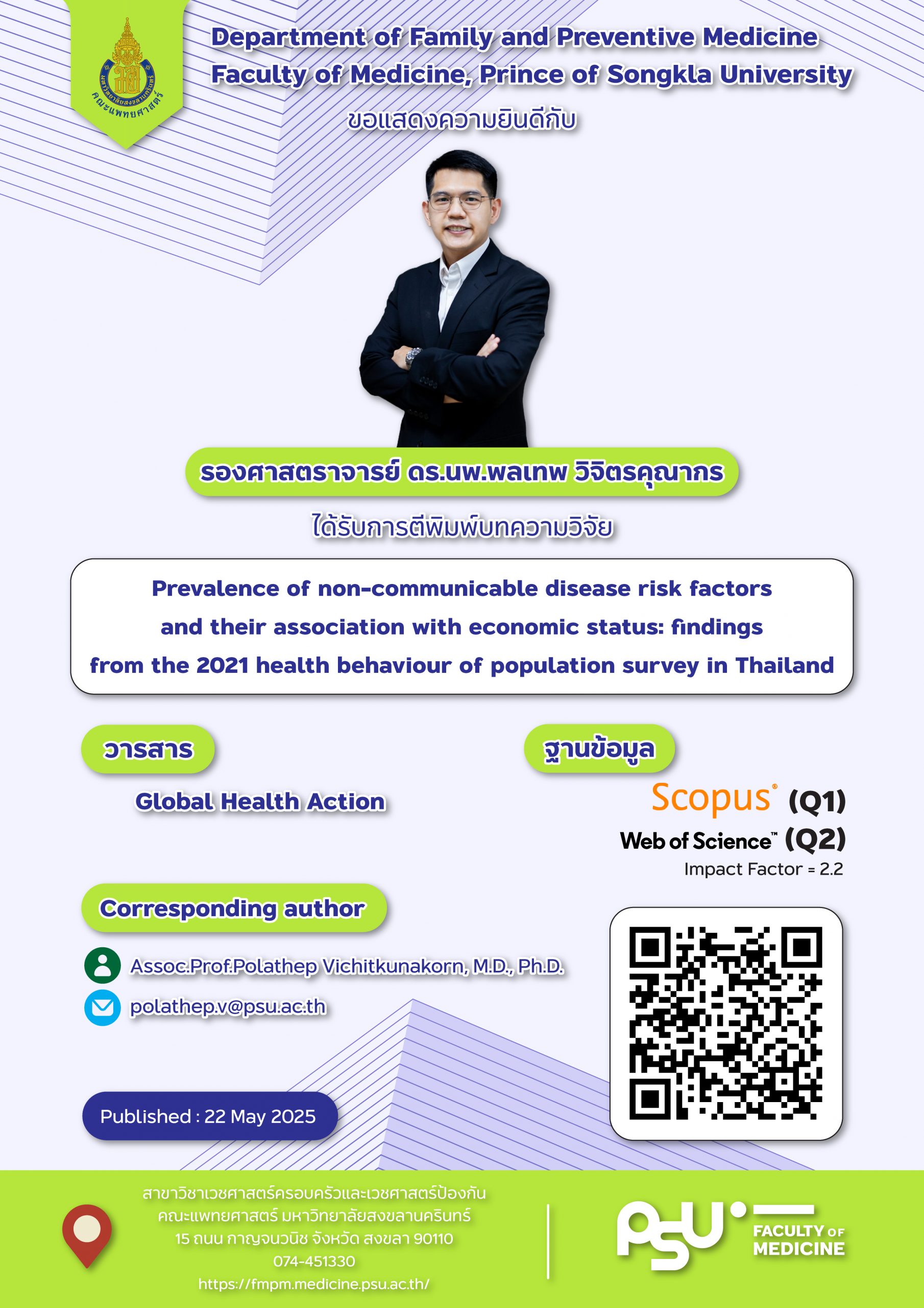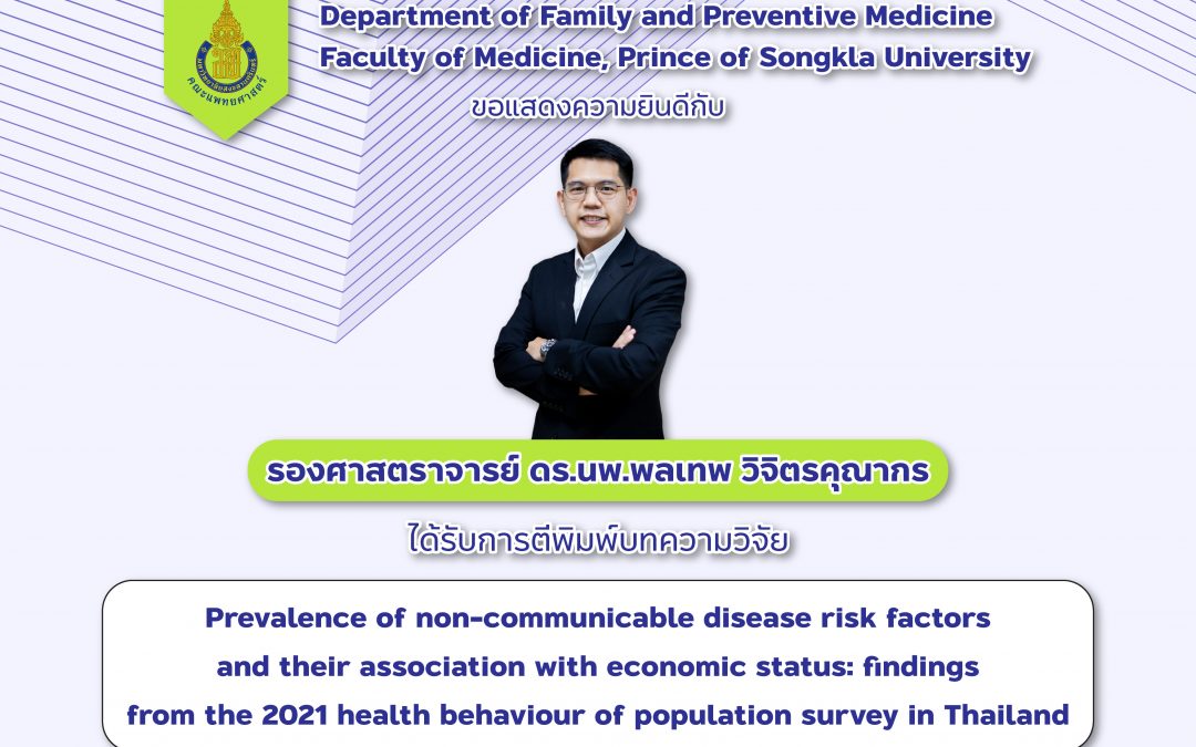 ขอแสดงความยินดีกับ รศ.ดร.นพ.พลเทพ วิจิตรคุณากร ที่ได้รับการตีพิมพ์บทความวิจัย เรื่อง Prevalence of non-communicable disease risk factors and their association with economic status: findings from the 2021 health behaviour of population survey in Thailand